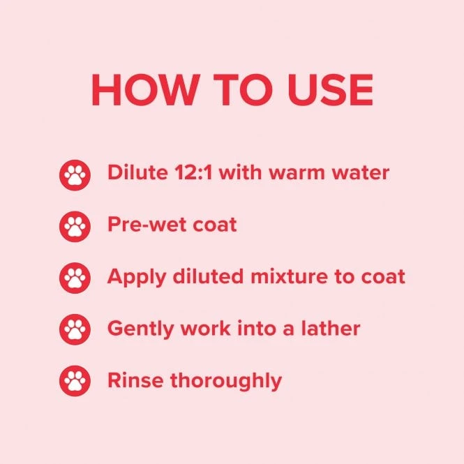Directions for use: Dilute shampoo with 12 parts warm water in a mixing bottle or jug. Wet the coat thoroughly with warm water. Pour diluted mix over coat, carefully avoiding the eyes, ears and mouth. Massage into coat using your hands, a sponge or rubber mitt for extra cleansing. Rinse thoroughly with warm water and repeat as necessary. Gently pat dry with a towel, then comb through. Dry completely or stay in a warm room to avoid colds and stiffening joints.