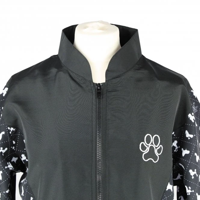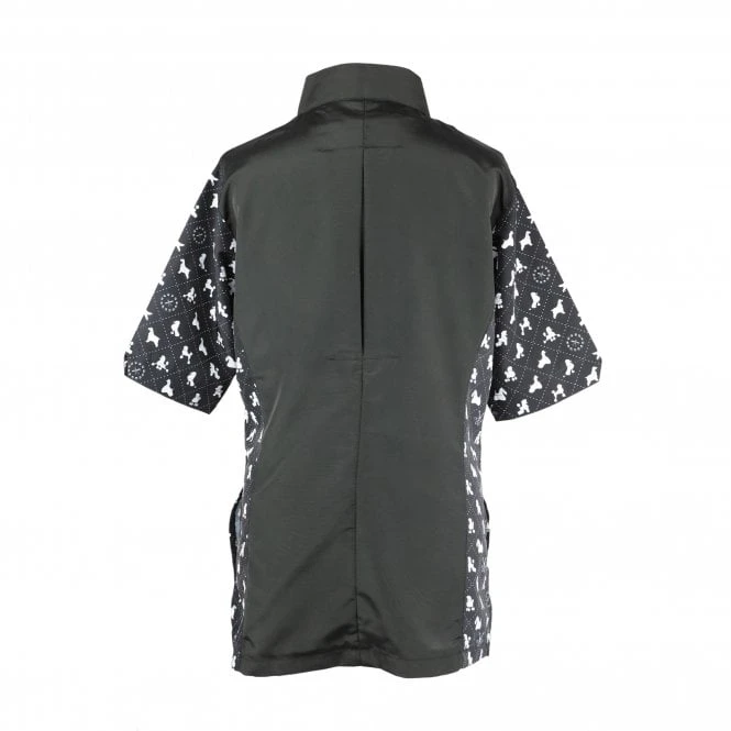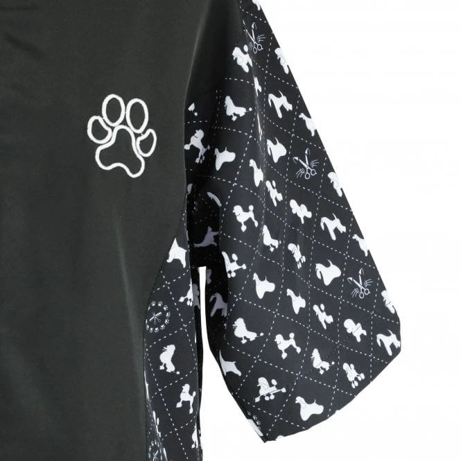 The Penny Poodle Mandarin Collar Tunic is both practical and wearable, and was designed with you in mind. This stylish short-sleeved black tunic features a white poodle design on the sides and sleeves and a paw print motif on the chest.