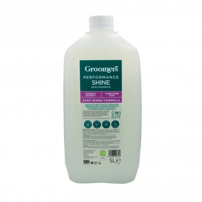 Groomers Performance Shine shampoo has been developed to help condition the coat for a healthy shine. Formulated with coconut extracts, this pH balanced shampoo will gently cleanse and deeply condition the coat leaving it looking nourished and glossy. Â
