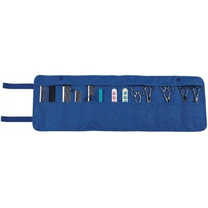 The Groomer Organiser offers a handy way to store dog grooming scissors, combs, clips and brushes safely and conveniently when not in use. This roll-up organiser has 7 storage pockets, and a main top flap that covers the tips of tools to prevent damage. Features a carry handle for easy transportation and two loops for simple storage.