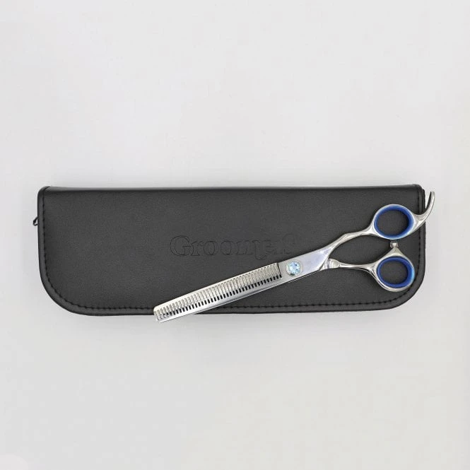 Groomers Topaz 7″ 50T Thinning Scissors are great for thinning the coat, and softening harsh scissoring and clipper lines. Featuring 50 teeth on one edge, for effortless thinning, and a smooth edge on the other, for a clean, snag free groom. Removing more hair quicker when compared with our blenders, these scissors create a natural look and remove bulk, leaving a smooth finish on the coat.